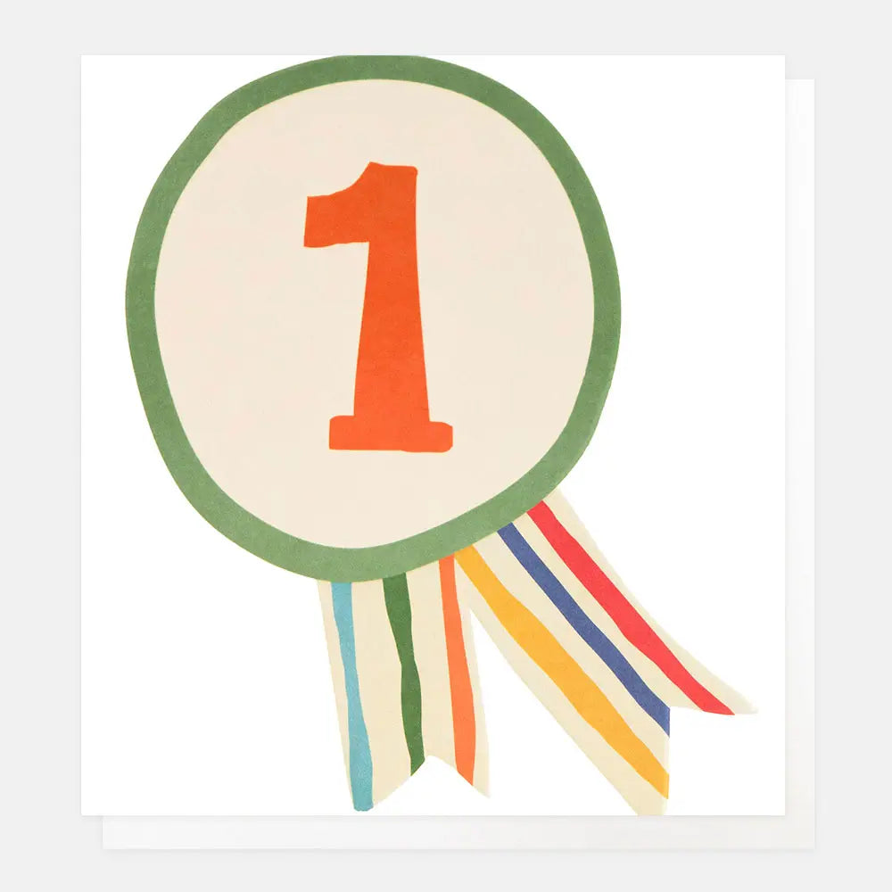 Part of their new Mini Milestones range, this first birthday card features a rosette with the number 1 in and colourful stripy ribbons, and is finished with embossed detail for that special touch. Blank on the inside for you to add your own personal message.