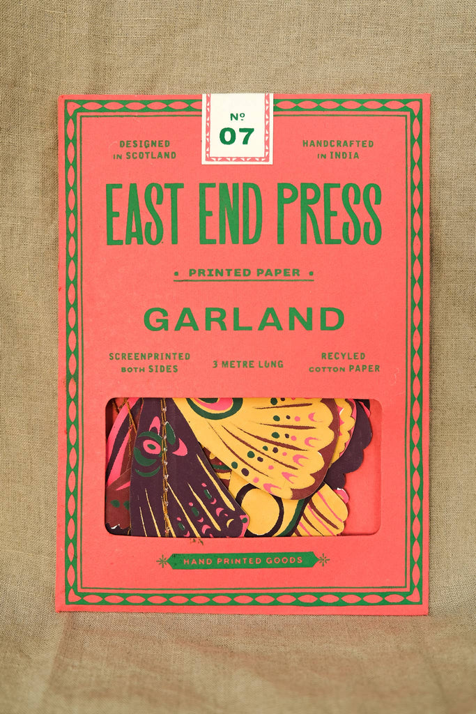 Add some colour and pattern to your walls with this beautiful butterfly garland! Ten large butterflies are sewn along the three metre length of this best selling design. Minimum order: 6 - 3 metres long - Includes 10 paper shapes, sewn along strong cotton thread - Screen printed by hand on both sides by talented artisans in Jaipur - Sustainably made from recycled materials