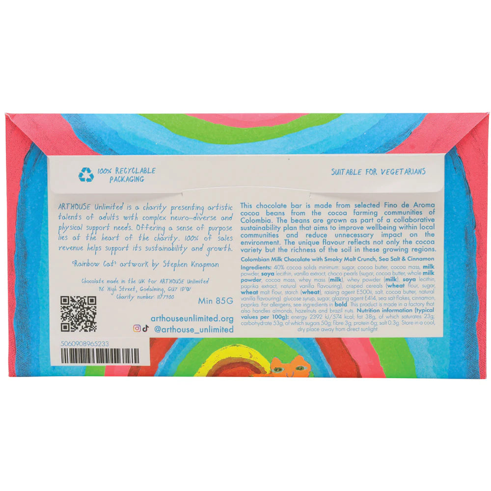 Each bar is wrapped in coloured foil and presented in a recyclable paper envelope that features Stephen Knapman’s bright and beautiful Rainbow Cat design and is finished with a shimmering blue foiled frame.