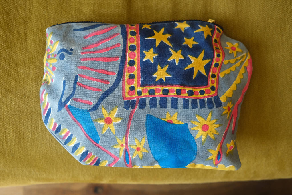Printed by hand from carved wooden blocks, this pouch is perfect storage for all your bits and bobs, art supplies or tablet. With a patterned cotton lining and sturdy brass zip, this pouch is beautifully made and large enough to be useful for a variety of objects. Minimum order: 6 - Illustrated fabric case, fully lined, 100% cotton - Block printed by hand on both sides by talented artisans in Jaipur - Shipped unpackaged with swing tag.
