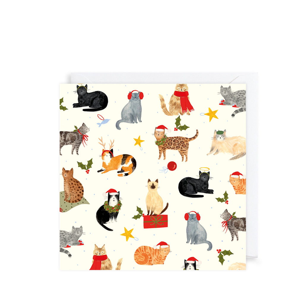 This beautiful pack of 10 Christmas cards consists of 5 sets of 2 cards. These cards feature a series of cats dressed for Christmas. The cards read 'Merry Christmas and a happy new year'.