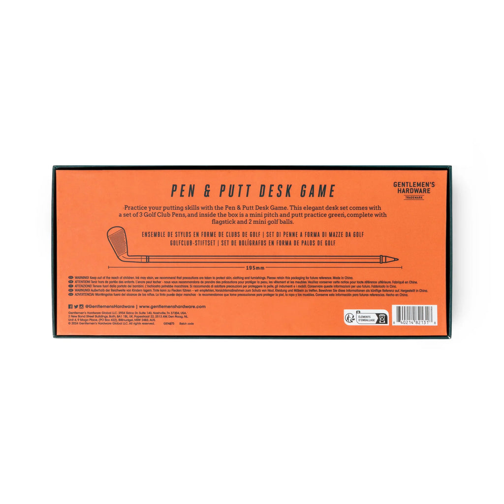 Practice your putting skills with the Pen & Putt Desk Game. This elegant desk set comes with a set of 3 Golf Club Pens with blue, black and red ink, and inside the box is a mini Pitch and Putt practice green, complete with flagstick and 2 mini golf balls.