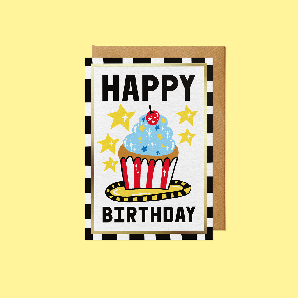 Introducing the Happy Birthday Cupcake card by Sanders de Roeper. This product is a creation of Tim and Hatty, a husband-and-wife design duo based in Hastings, East Sussex. They believe in the power of positivity and create designs to uplift, connect, and spark joy. This card is a result of their combined experience in graphic design and fashion.