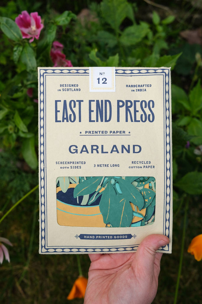 Easy to keep alive, ten lush pot plants are sewn along this garland. Perfect for adding greenery to your home with no watering required! Minimum order: 6 - 3 metres long - Includes 10 paper shapes, sewn along strong cotton thread - Screen printed by hand on both sides by talented artisans in Jaipur - Sustainably made from recycled materials