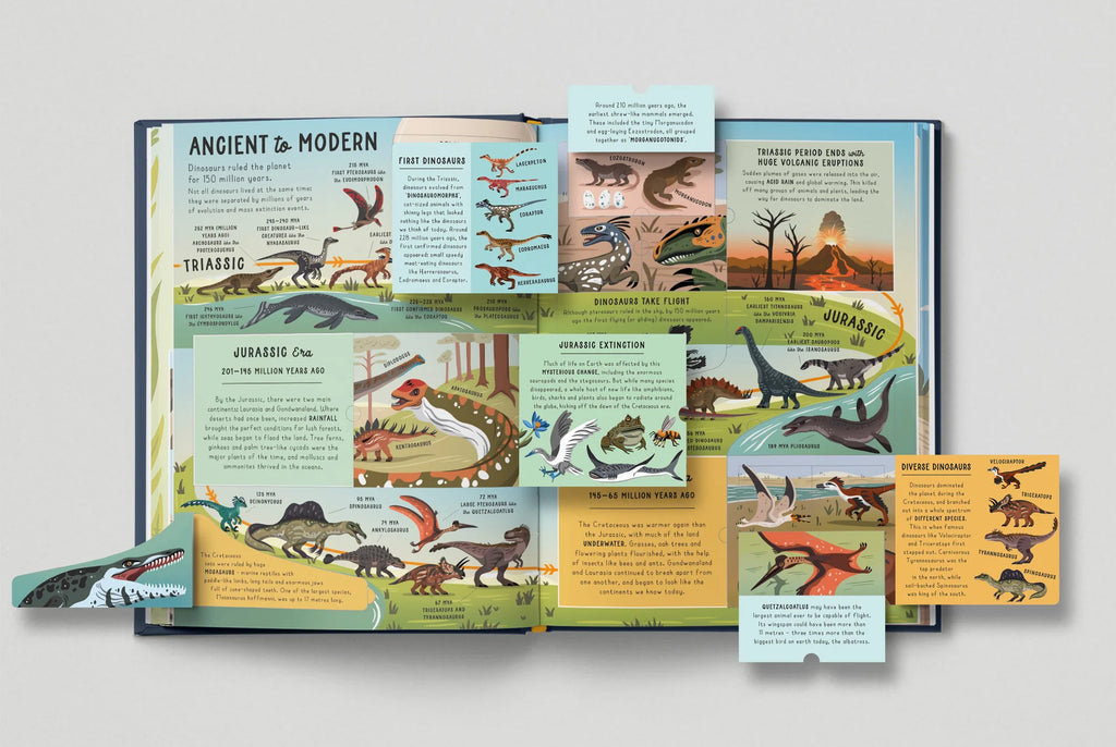 Each of the interactive spreads includes several huge flaps, which reveal even more flaps underneath, perfect for little fingers to lift and learn. Every spread explores the prehistoric world from a different perspective, arranging the dinosaurs from most ancient to most recent, from biggest to smallest, from hunters to hunted, and even from the seas to the skies.