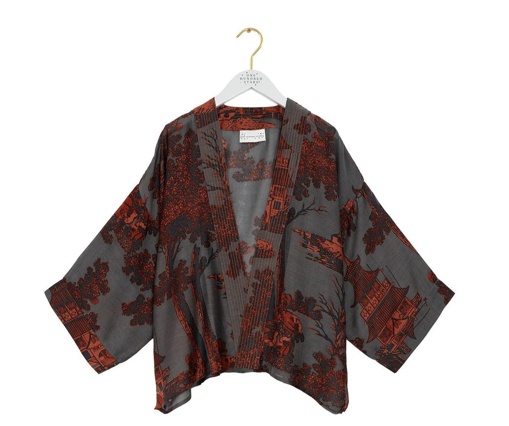 The One Hundred Stars Pagoda Pewter Kimono features a striking giant pagoda and tree design with a mirror image, set against a grey pewter base accented by rust and charcoal highlights for an authentic Spitalfields feel. Its loose ¾ length sleeves and open front create an effortlessly elegant silhouette. The lightly embroidered lapel adds a delicate touch, making it perfect to wear over a matching camisole and jeans in summer or layered over a polo neck during cooler seasons. Embrace timeless style with this versatile, artful kimono.