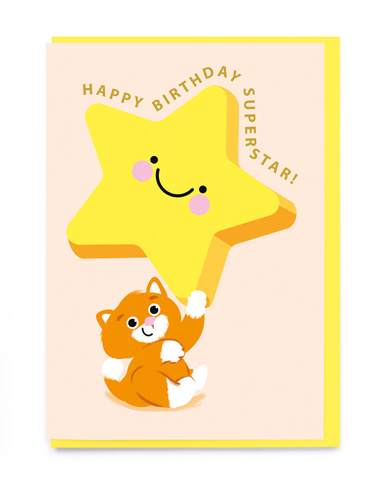 Superstar kitty ‘happy birthday supertar!’ gold foil message. Blank inside and supplied with a yellow envelope.
