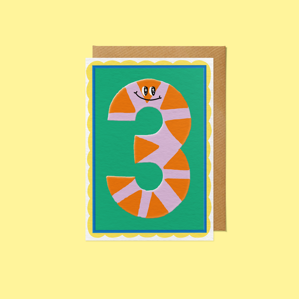 Bold, Colourful and Fun! Number 3 character for a third Birthday Card from Sanders de Roeper. - Luxurious 320 GSM fully recycled and recyclable board - Embossment with Spot UV - Elegant recyclable kraft ribbed envelope