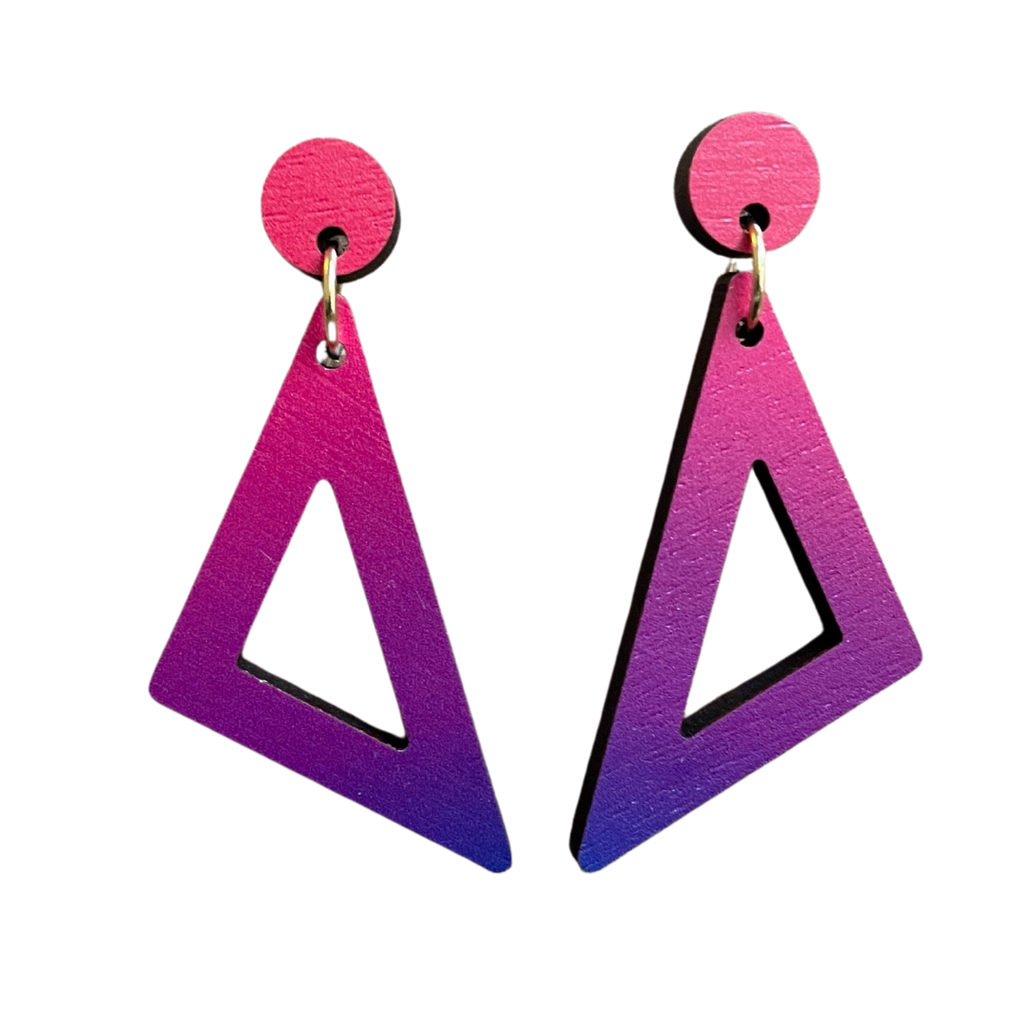 Details: > Triangle drop measures approx 38mm with a 10mm top stud. > Made from responsibly sourced maple veneered wood > Hypo-allergenic stainless steel ear posts & backs > Super Lightweight > Vibrant colours Colours: > Purple Haze > Sea Green Circle > Fire Orange Circle > Ruby Sunrise Circle > Ocean Blue Circle > Galaxy Circle