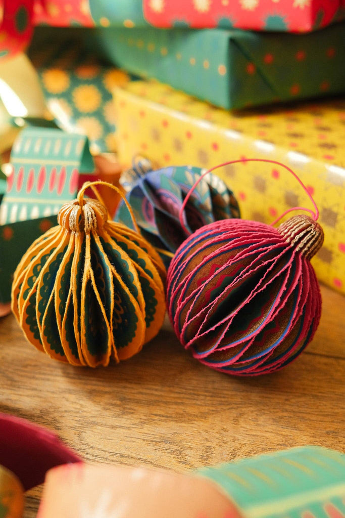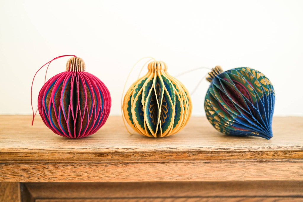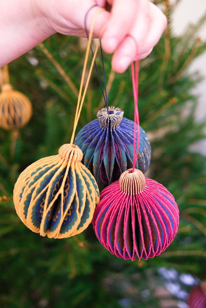 Composed of intricate layers of recycled cotton paper, each decoration unfolds to reveal a three-dimensional bauble honeycomb. Minimum order: 6 - One bauble-shaped paper ornament with a cotton hanging loop - Each secured with a magnet - Screen printed by hand by talented artisans in Jaipur - Sustainably made from recycled materials Disclaimer: this item is not a toy, and contains magnetic components. The many layers of our honeycomb decorations are assembled by hand. When freshly opened, they may need a little bit of gentle encouragement to expand and for the ends to stick together with the magnet. As the layers loosen with time after being tightly packed, this should become easier.