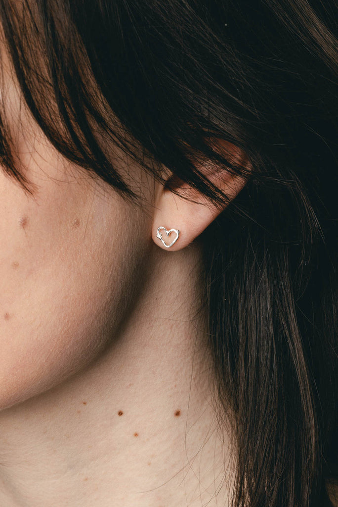 A pair of mini stud earrings, crafted by hand from silver twigs and shaped into little hearts