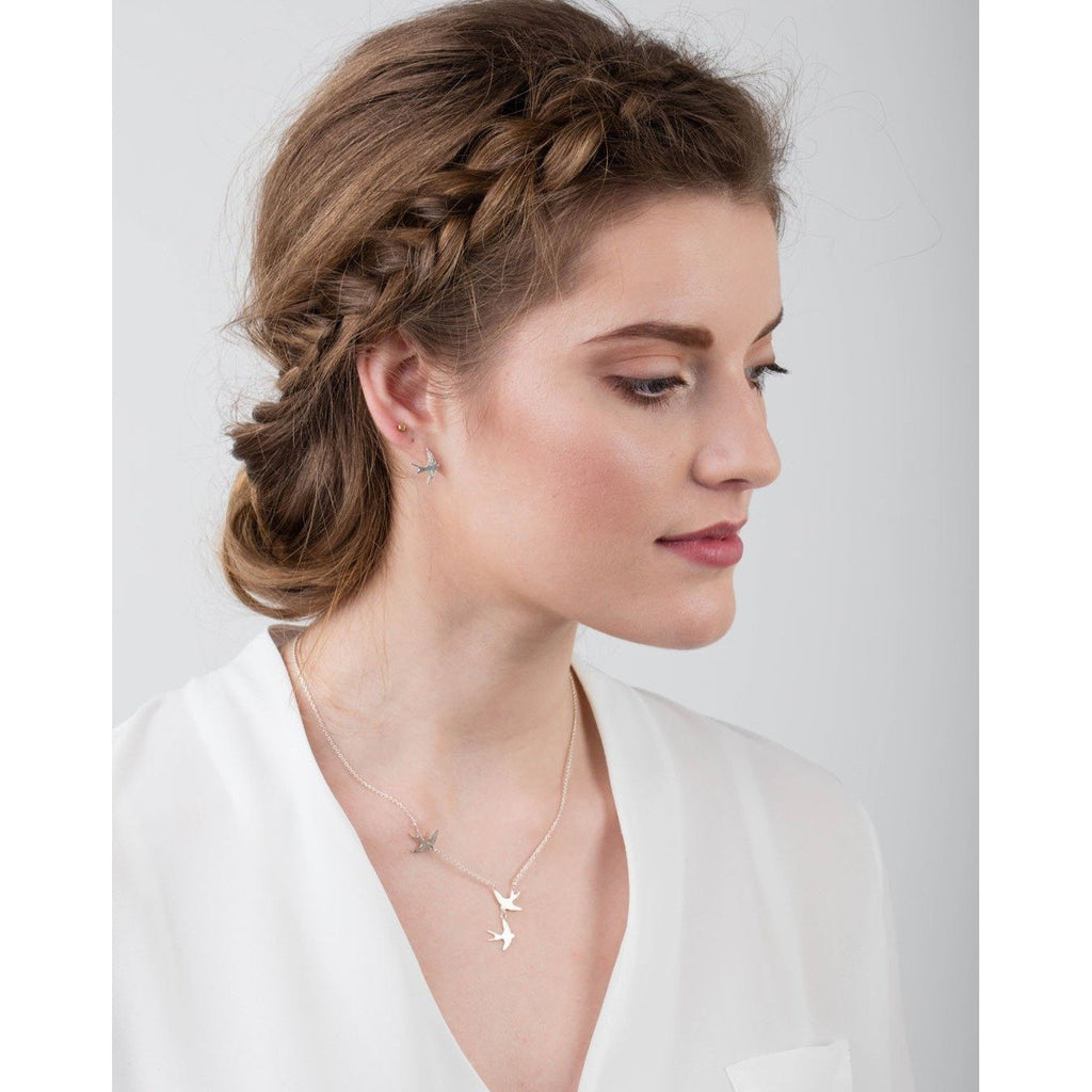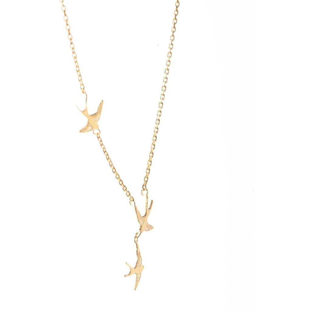 This necklace features a three swallows gliding across the sky. The necklace measures 43cm in length with each of the swallows measuring 1.5cm wide by 1.5cm tall. The necklace is available in 22ct gold vermeil.