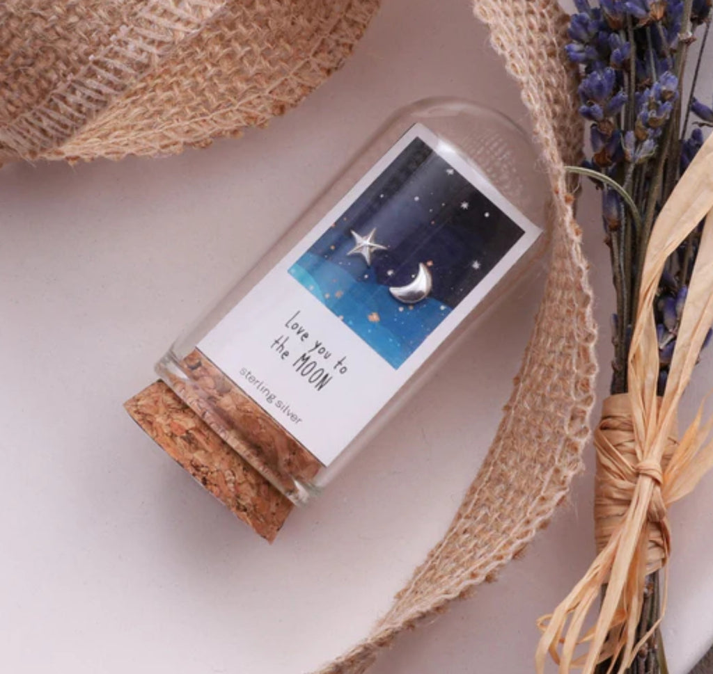 These stud earrings are packaged in a small glass jar with a cork stopper.