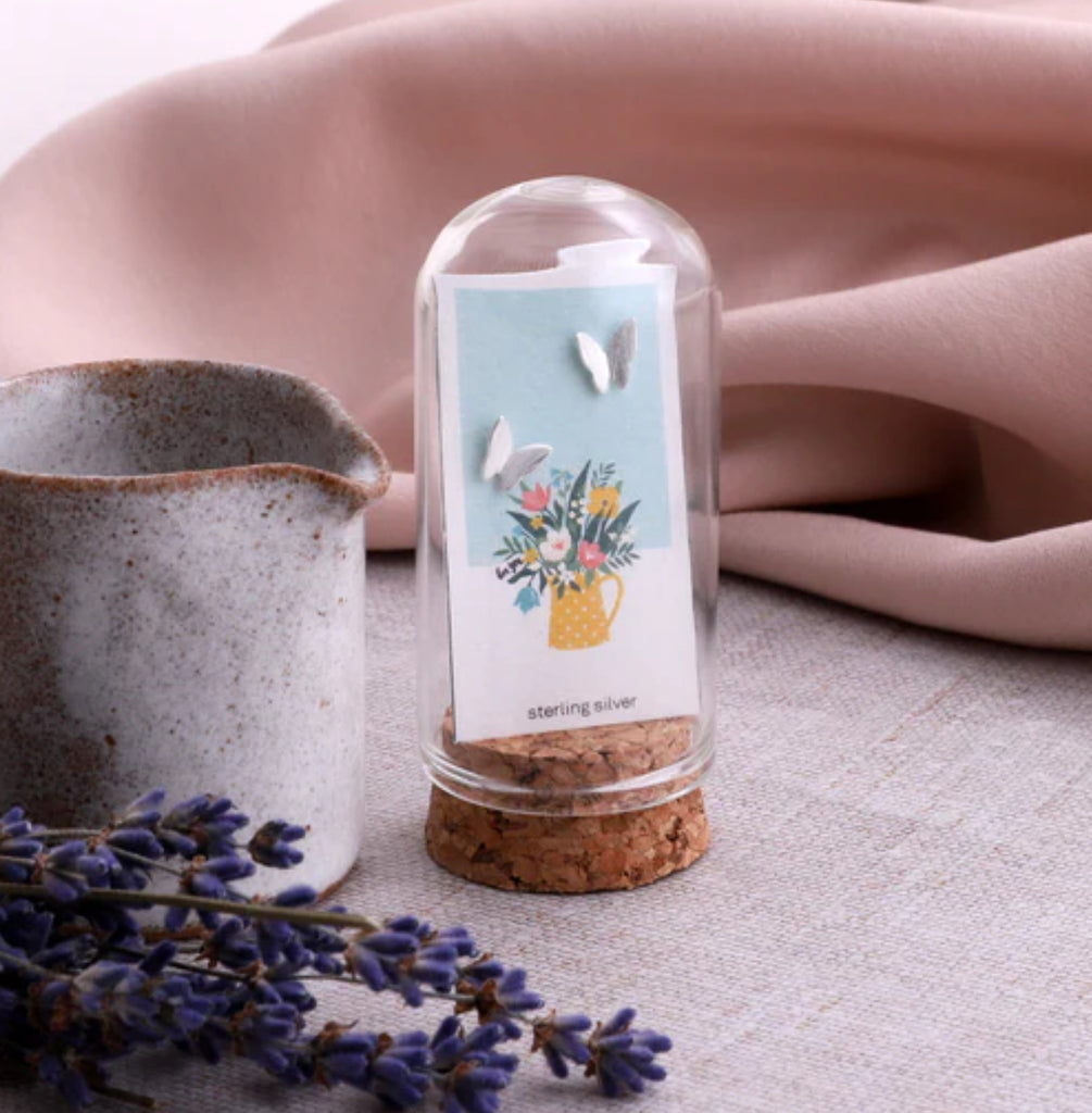 These stud earrings are packaged in a small glass jar with a cork stopper.