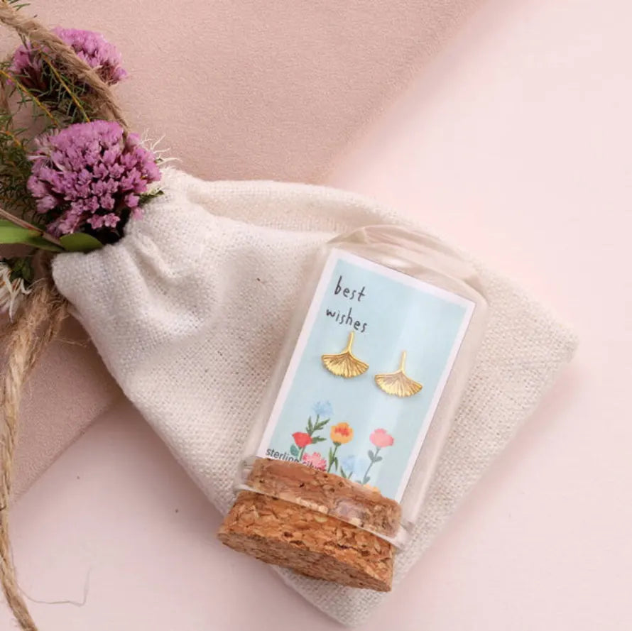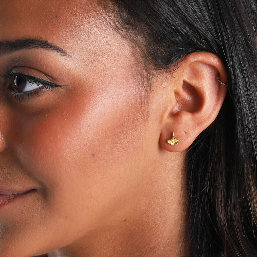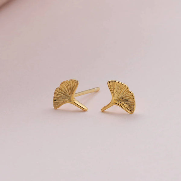 Finely wrought from sterling silver, these delicate little ear studs in the shape of ginkgo leaves provide a piece of natural allure to any ensemble. Available in either a silver finish or plated with 18k gold these studs, with their art nouveau styling, would make a perfect accessory to any outfit and for any occasion, be it formal or casual.