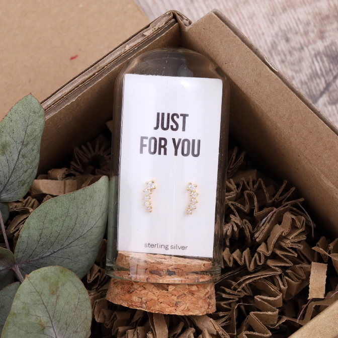 These stud earrings are packaged in a small glass jar with a cork stopper.