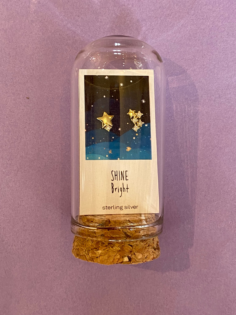 These stud earrings are packaged in a small glass jar with a cork stopper.