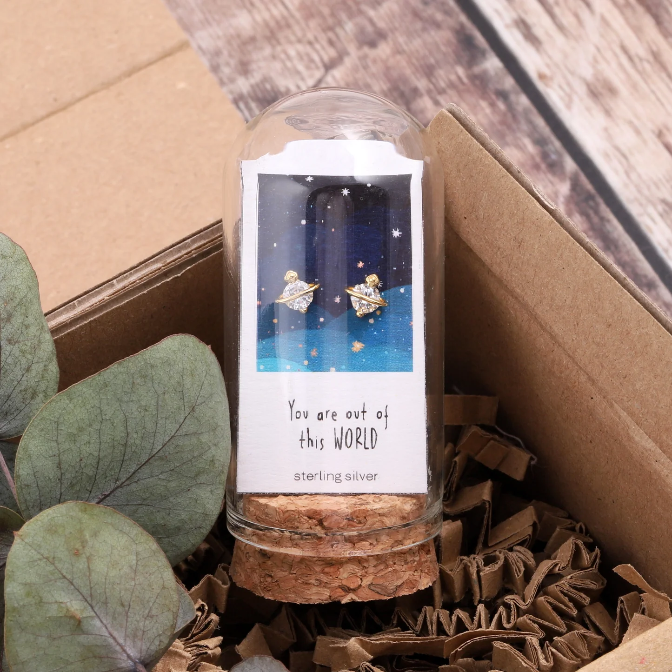 These stud earrings are packaged in a small glass jar with a cork stopper.