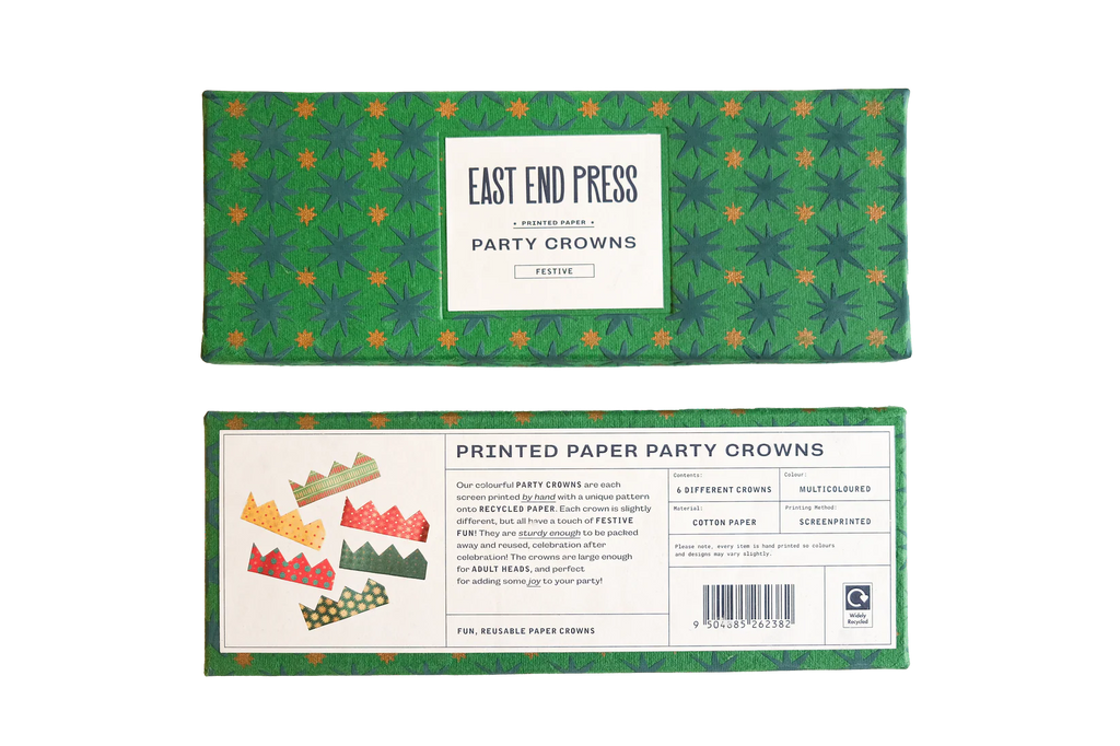 These colourful party crowns are each screen printed by hand with a unique pattern onto recycled paper. Each crown is slightly different, but all have a touch of festive fun! They are sturdy enough to be packed away and reused, celebration after celebration! The crowns are large enough for adult heads, and perfect for adding some joy to your party!