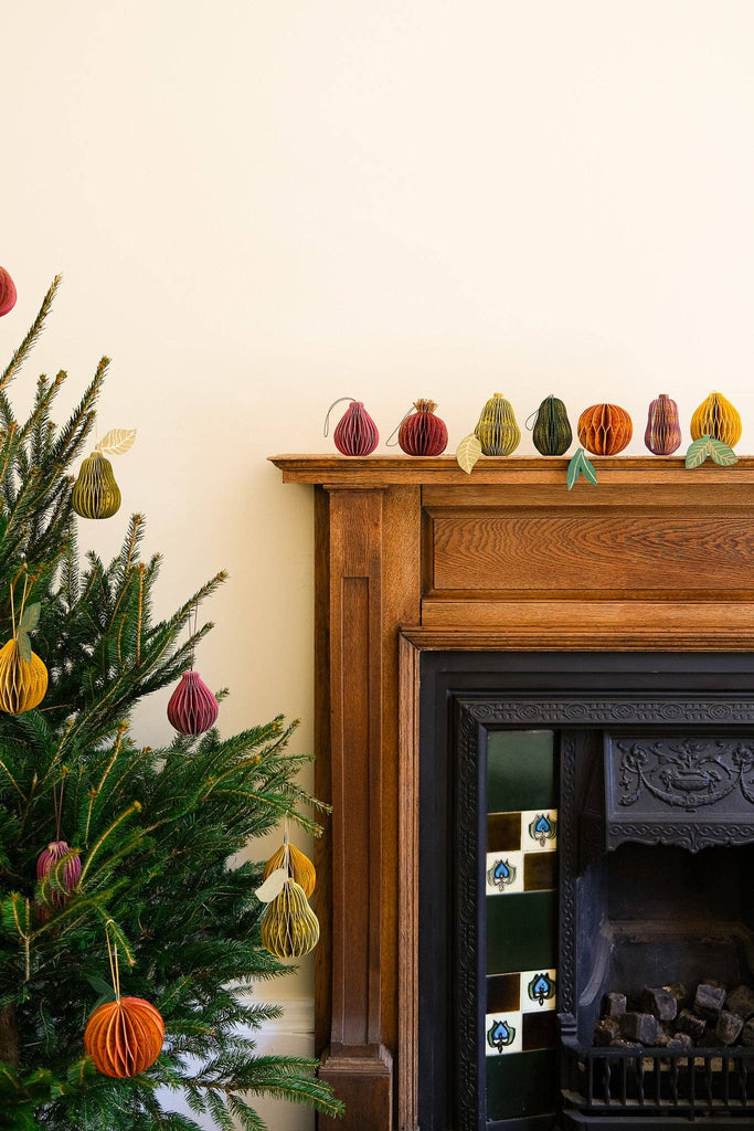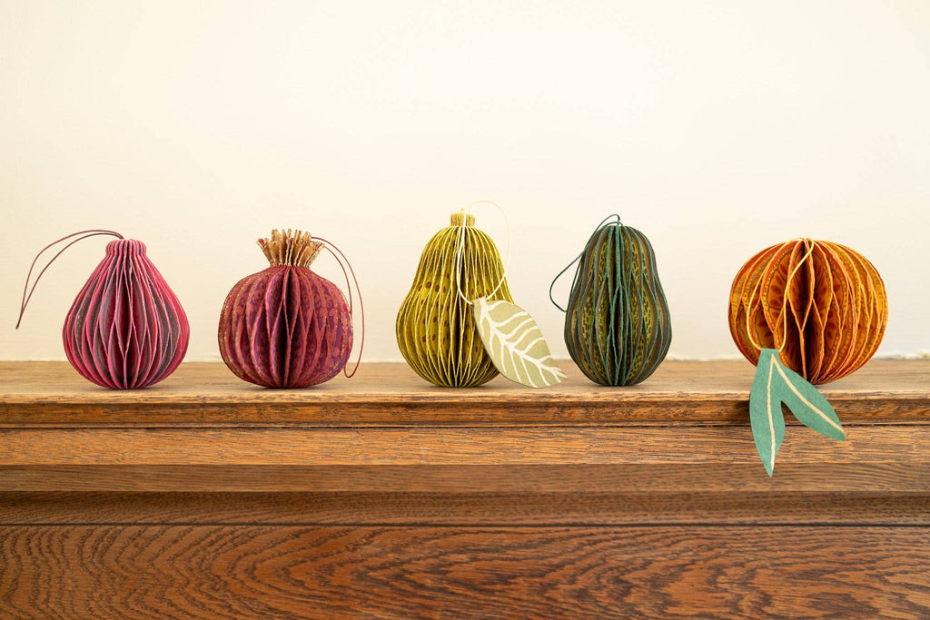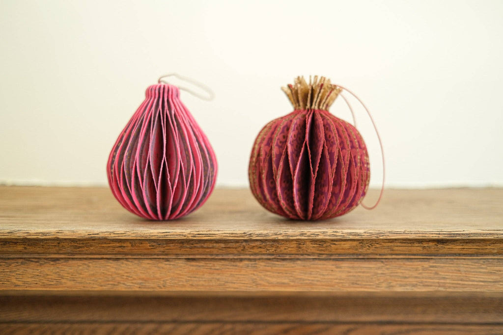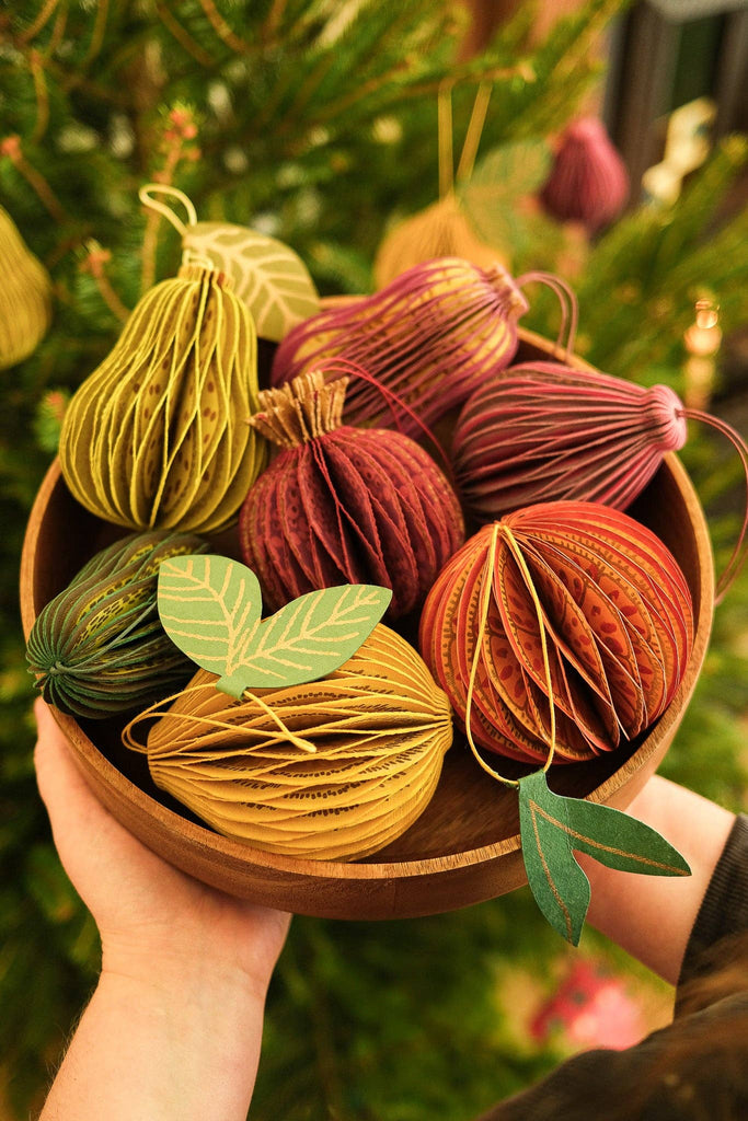 Composed of intricate layers of recycled cotton paper, each decoration unfolds to reveal a three-dimensional pomegranate honeycomb. Minimum order: 6 - One pomegranate bauble-shaped paper ornament with a cotton hanging loop - Each secured with a magnet - Screen printed by hand by talented artisans in Jaipur - Sustainably made from recycled materials Disclaimer: this item is not a toy, and contains magnetic components. The many layers of our honeycomb decorations are assembled by hand. When freshly opened, they may need a little bit of gentle encouragement to expand and for the ends to stick together with the magnet. As the layers loosen with time after being tightly packed, this should become easier.