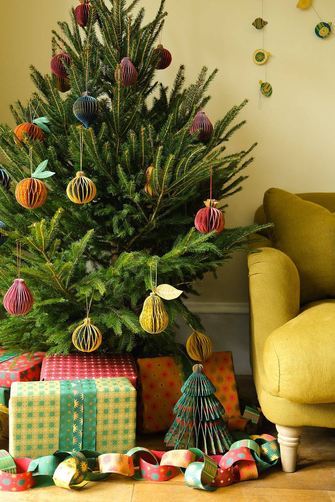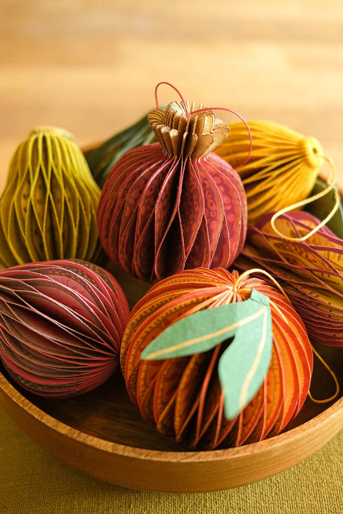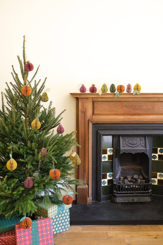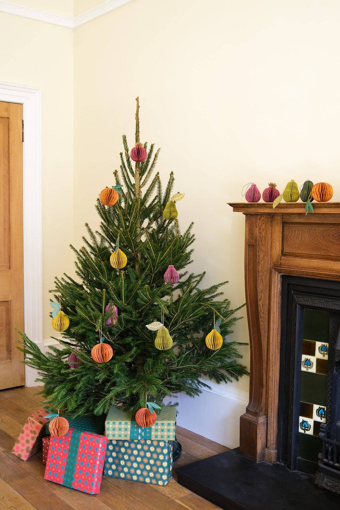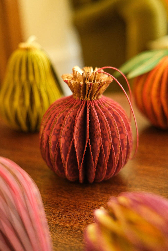 Composed of intricate layers of recycled cotton paper, each decoration unfolds to reveal a three-dimensional pomegranate honeycomb. Minimum order: 6 - One pomegranate bauble-shaped paper ornament with a cotton hanging loop - Each secured with a magnet - Screen printed by hand by talented artisans in Jaipur - Sustainably made from recycled materials Disclaimer: this item is not a toy, and contains magnetic components. The many layers of our honeycomb decorations are assembled by hand. When freshly opened, they may need a little bit of gentle encouragement to expand and for the ends to stick together with the magnet. As the layers loosen with time after being tightly packed, this should become easier.