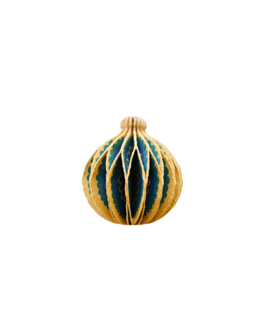 Composed of intricate layers of recycled cotton paper, each decoration unfolds to reveal a three-dimensional bauble honeycomb. Minimum order: 6 - One bauble-shaped paper ornament with a cotton hanging loop - Each secured with a magnet - Screen printed by hand by talented artisans in Jaipur - Sustainably made from recycled materials Disclaimer: this item is not a toy, and contains magnetic components. The many layers of our honeycomb decorations are assembled by hand. When freshly opened, they may need a little bit of gentle encouragement to expand and for the ends to stick together with the magnet. As the layers loosen with time after being tightly packed, this should become easier.