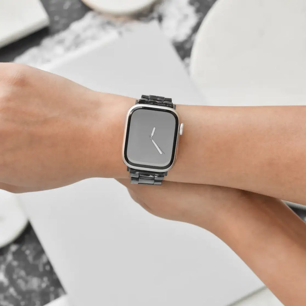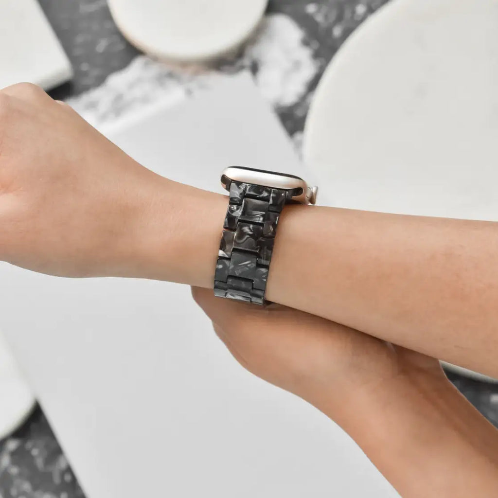 Who knew an Apple Watch Strap could look so... sophisticated?! Upgrade your Apple Watch's style in less than a second with our Luxe Black Marble Apple Watch Strap. Resin Apple Watch Strap Stainless Steel buckle Adjustable strap Metal band link remover tool included Strap fits ALL Apple Watch models including Ultra and SE. Size: 38/40/41mm