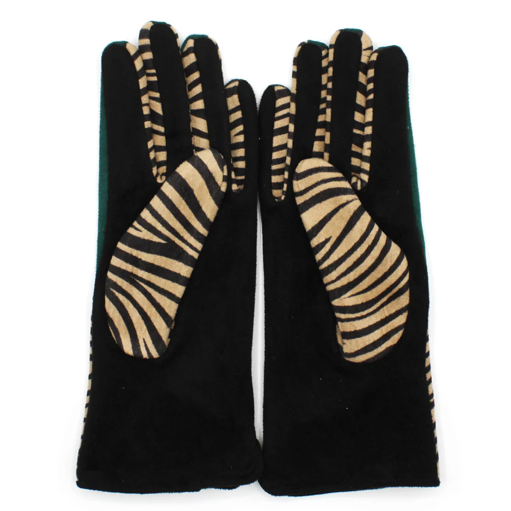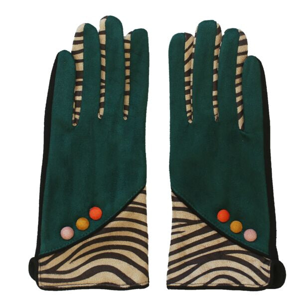 Features: These statement Animal print gloves feature a forest Green and contrasting Zebra print detail and include pops of colour with a line of fabric covered buttons . They are super soft and are the perfect statement gloves to keep your hands toasty warm this winter!