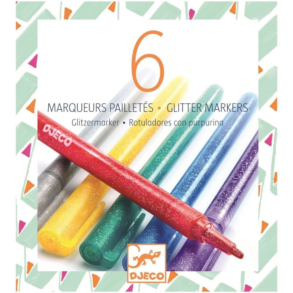 Djeco Glitter Markers in 6 pretty sparkling colour are high quality, easy to work with gel pens for kids of all ages. Glitter pens are always popular with children for adding special touches and unique colour to their artwork, school books, scrapbooks and home made cards.