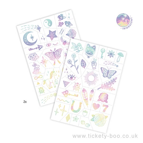 The Djeco tattoos consist of 2 sheets with lots of large and small motifs. The tattoos should be applied directly on the skin with a damp cloth.
