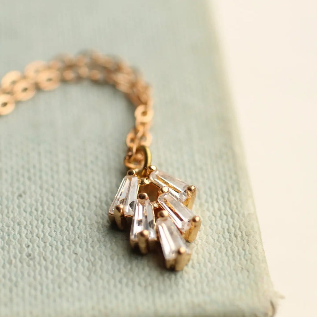 This beautifully delicate necklace is made with gold plated brass and features a graduated art deco design. The tiny cubic zirconia jewels are cut into perfect rectangles. They remind us of classic Deco architecture, like the Chrysler building! The pendant measures just 15mm (just over half an inch inch) and hangs from a fine gold plated brass chain. This necklace is available in a choice of chain lengths. Please refer to our illustration for a better idea of what each chain length would look like when worn. The model is wearing a 16" chain in our photo.