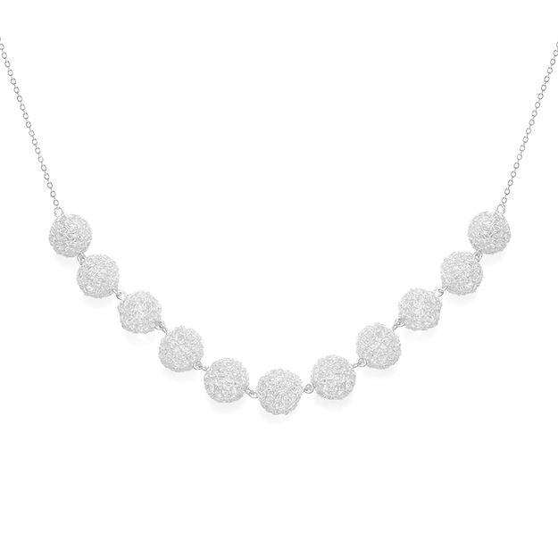 This delicate necklace is made from fine silver wire skillfully crocheted around sparkling crystal beads.