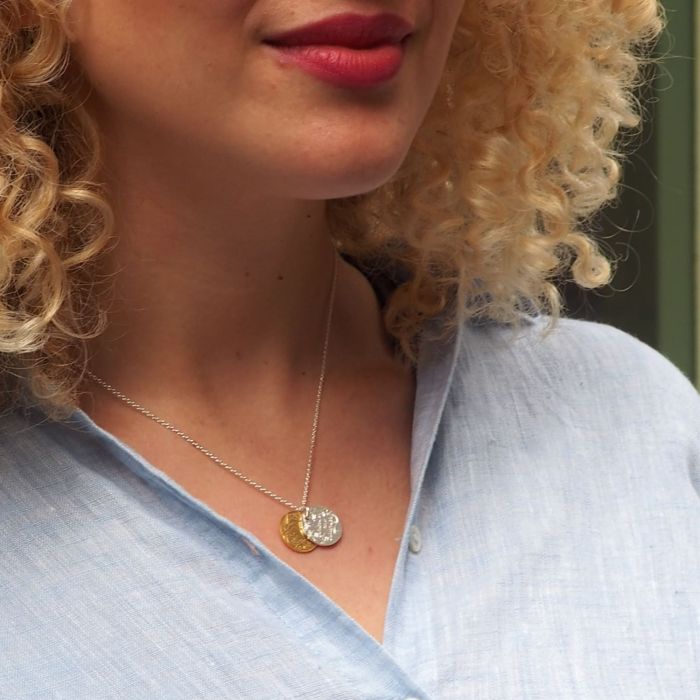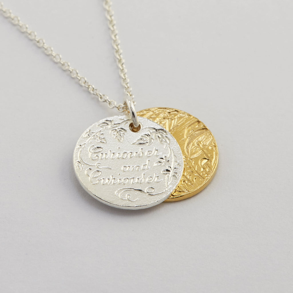 A sterling silver disc engraved with the words 'Curiouser and Curiouser’, moves away to reveal a magical world beneath in this Limited Edition pendant necklace. The front disc is handmade in sterling silver, with the disc behind plated in 22ct gold.