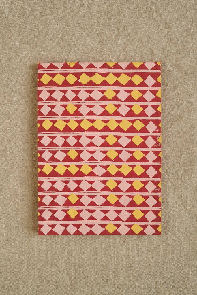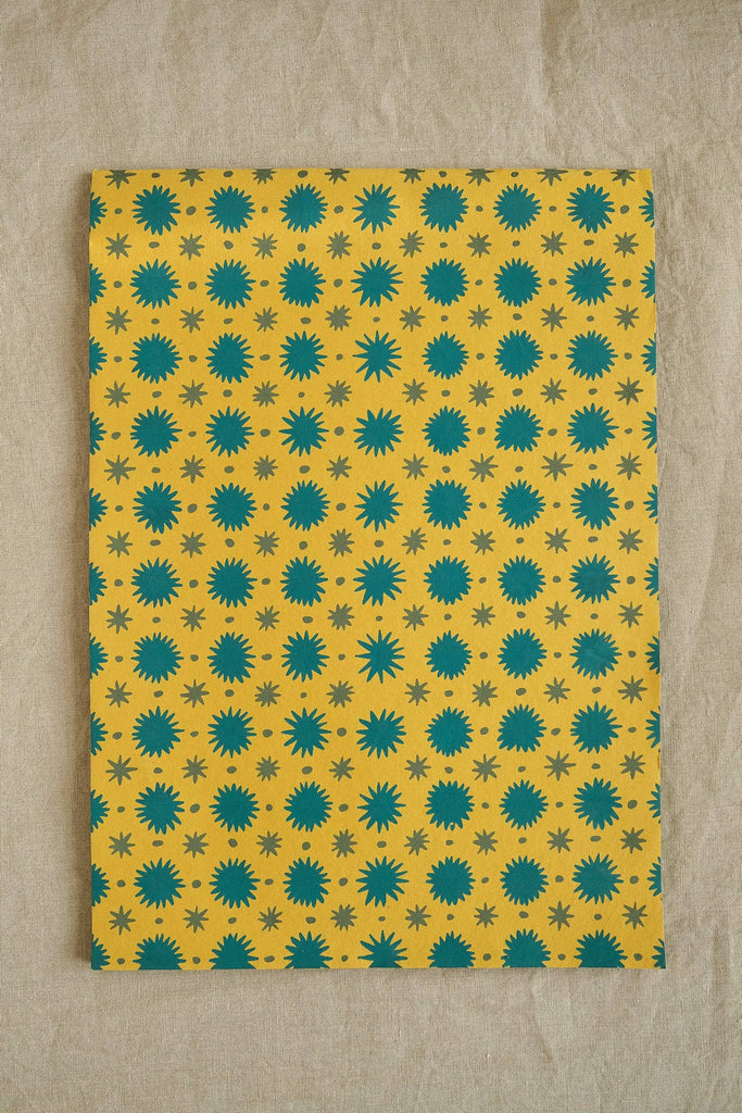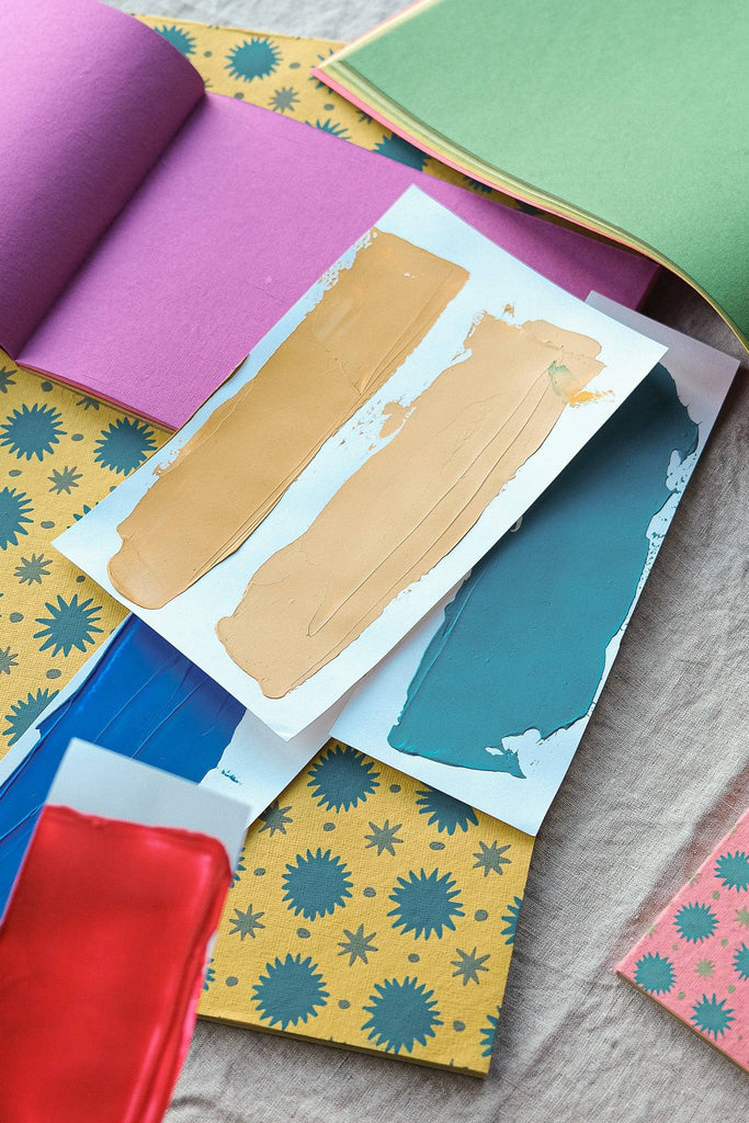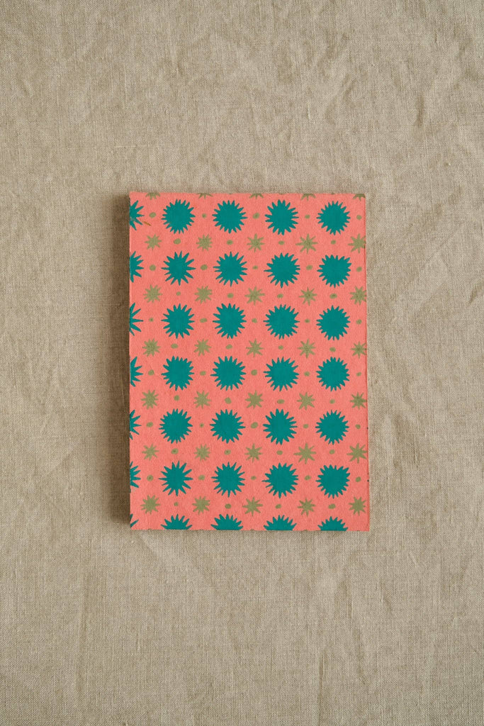 This scrapbooks has twenty pages of handmade recycled paper in different bright colours. Every part of the book is made from 120gsm 100% recycled content paper, made from pulped down cotton waste from India's textile industry. The scrapbooks have a colourful patterned cover, and vital info printed on the reverse. Scrapbook containing green/yellow and teal paper – Covers are screen printed by hand by talented artisans in Jaipur – Sustainably made from recycled materials