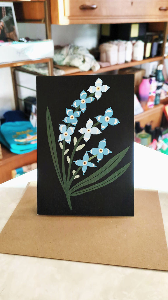 Designed using lino prints. The design is carved on lino and hand printed onto fabric before being printed as cards.