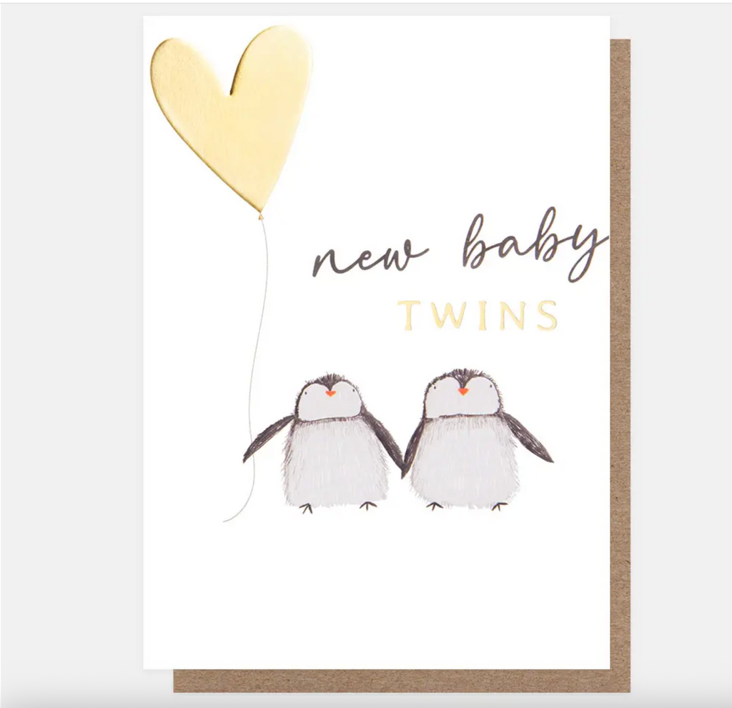 In a slim size with gold foil, embossed details and supplied with a Kraft envelope, With a design of two feathered penguins and a gold foiled heart balloon, here is your perfect card to celebrate the arrival of twins.