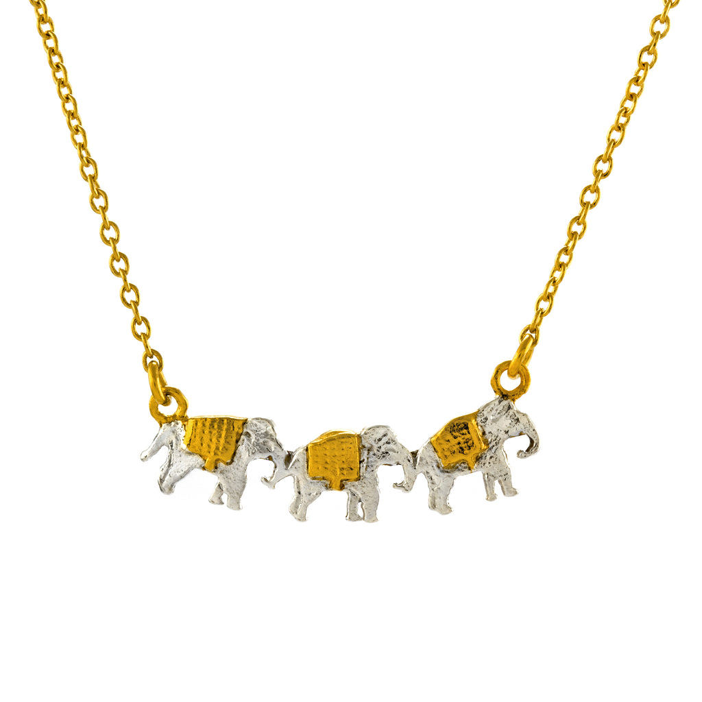 Three miniature Elephants march together in this whimsical in-line necklace. Handcrafted from Sterling Silver with 22ct Gold detailing. Alex Monroe Jewellery is inspired by nature and handcrafted in our London Workshop.