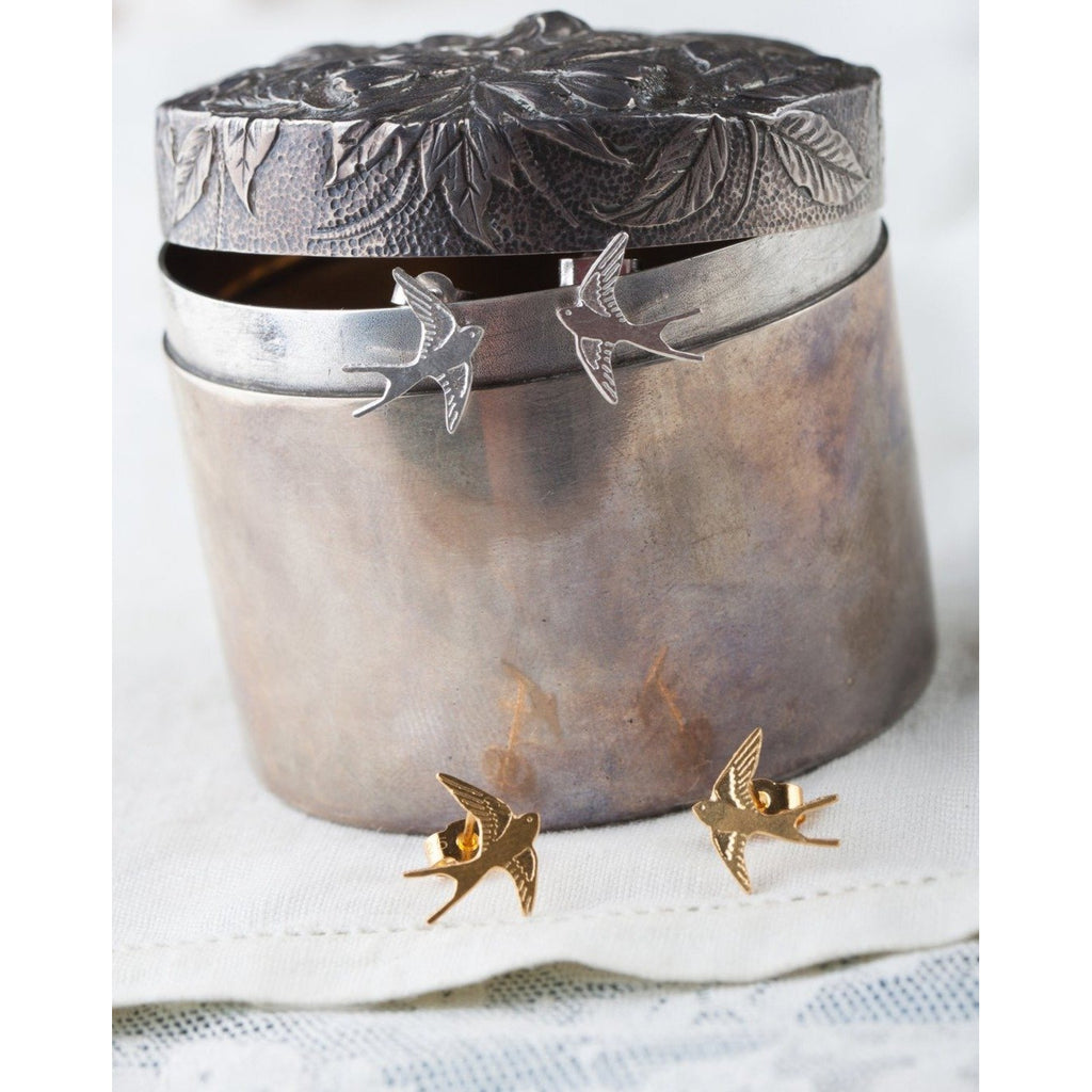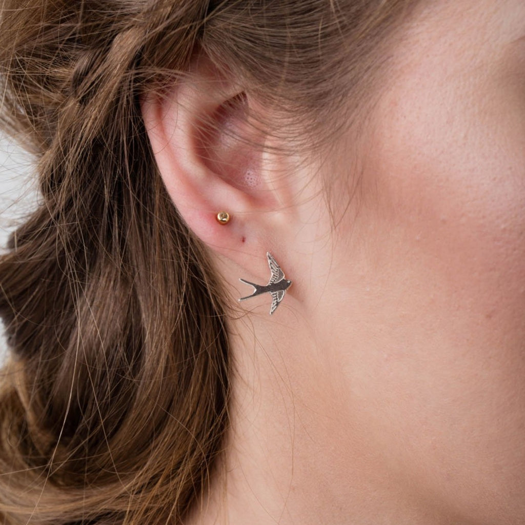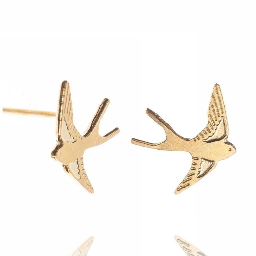 These stud earrings encapsulate the agile elegance of the swallow as she flies across the sky. They measure 1.5cm long by 1.5mm tall. They are available in solid 925 silver or in 22ct gold vermeil.