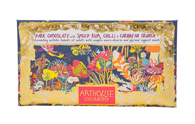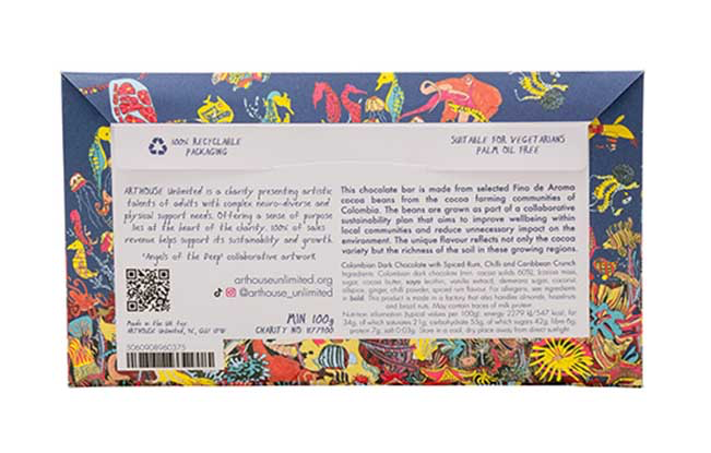The Angels of the Deep artwork is a delicate collaborative artwork born from individual artists’ drawings which explored life on the coral reef. Each artist’s style and unique outlook is brought together in a carefully mastered composition. This beautiful design is a fitting way to celebrate the delicious dark chocolate, spiced rum, chilli and caribbean crunch.