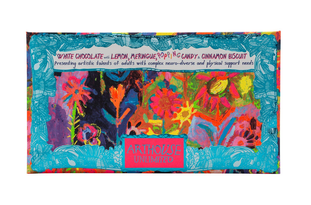 Arthouse Unlimited Organic Handmade Chocolate -Sunflowers in the Hills – White Chocolate, Lemon Meringue, Popping Candy and Cinnamon Biscuit Crunch