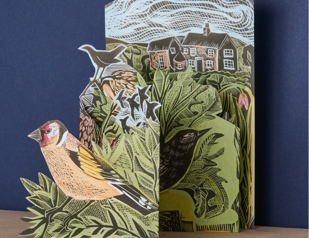 Garden Birds concertina die-cut card is a charming freestanding 3D card by artist Angela Harding