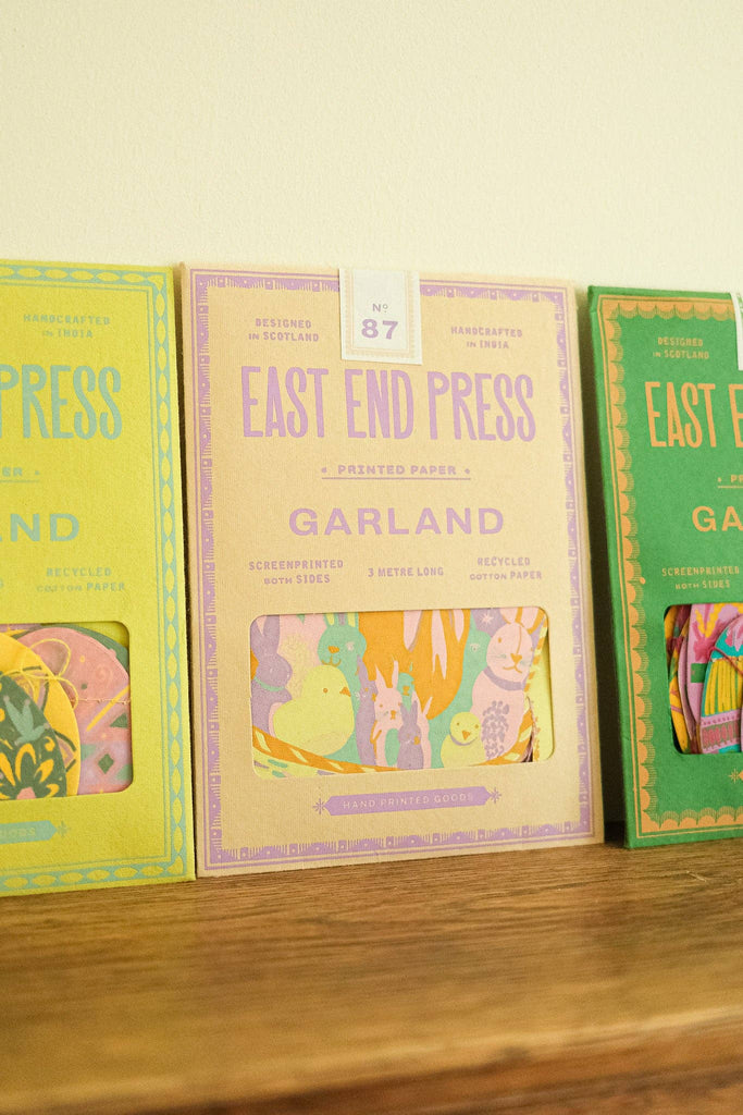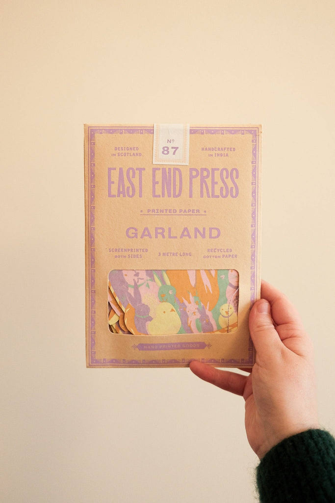Twelve whimsical, vintage-style illustrations inspired by classic storybooks are sewn along this three metre garland. Minimum order: 6 * 3 metres long * Screen printed by hand on both sides by talented artisans in Jaipur * Sustainably made from recycled materials