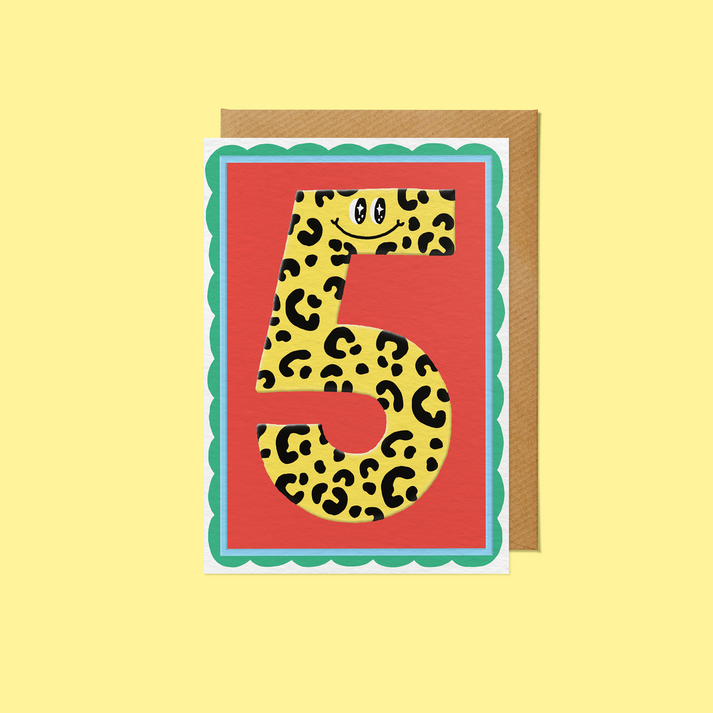 Bold, Colourful and Fun! Number 5 character for a fifth Birthday Card from Sanders de Roeper. - Luxurious 320 GSM fully recycled and recyclable board - Embossment with Spot UV - Elegant recyclable kraft ribbed envelope