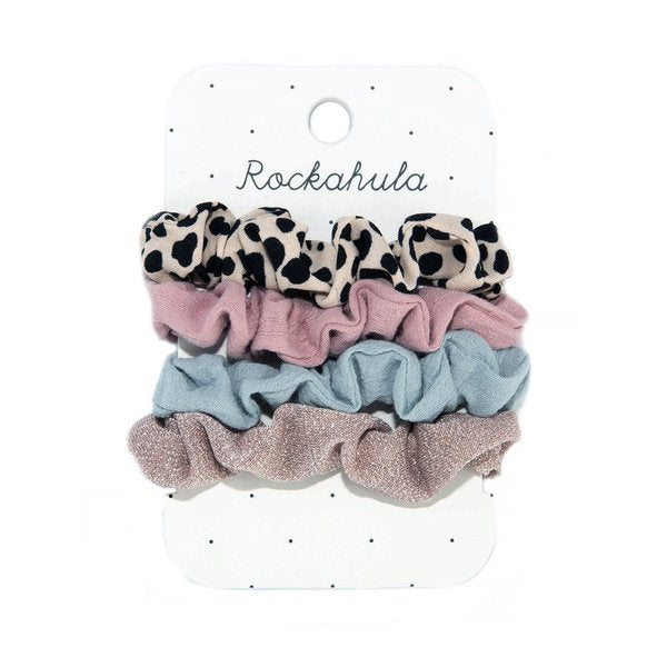 Take a walk on the wild side with this pack of four scrunchies, with two in our softest cheesecloth fabric, one in our gorgeous leopard print fabric and one in our pink lurex shimmering fabric. The purrr-fect addition to your pony tail!