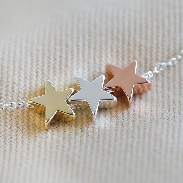 A delicate necklace for lovers of stars and the night sky, this mixed metal charm necklace is perfect to wear alone or pair with other jewellery pieces of a matching colour. Featuring a sterling silver plated trace chain threaded with three star beads, it has two link rings to decide your wearing length, depending on your styling for that day. A wonderful everyday necklace that will complement plenty of pieces in your jewellery box.