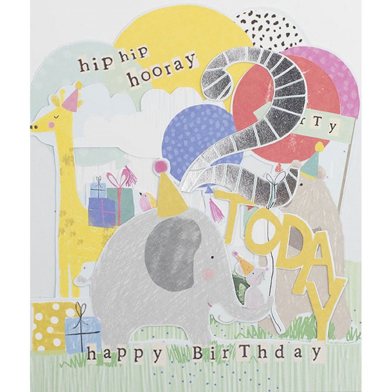 This card has a beautiful design which features a variety of animals on their way to a party. On the front of the card is an elephant which is holding a balloon which reads ‘2 TODAY’. The elephant has a mouse sat on its trunk and underneath him is a message which reads ‘happy birthday’ in a black typewritten font. Open up the zig zag card and you’ll see the other animals with balloons and presents and the text ‘hip hip hooray’. On the back page of the card reads ‘happy 2nd birthday’ but there is plenty of space for you to add your own heart-warming personalised message. This is all set against a pale blue and green background.