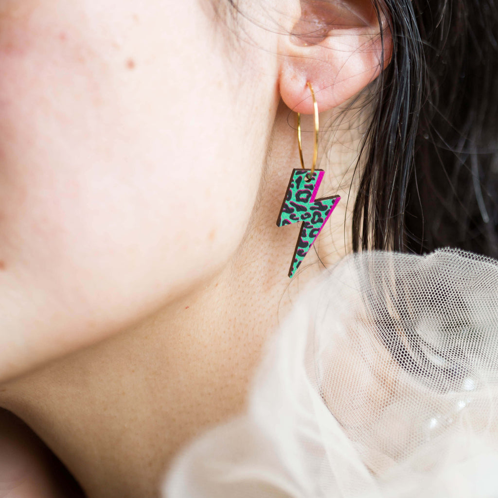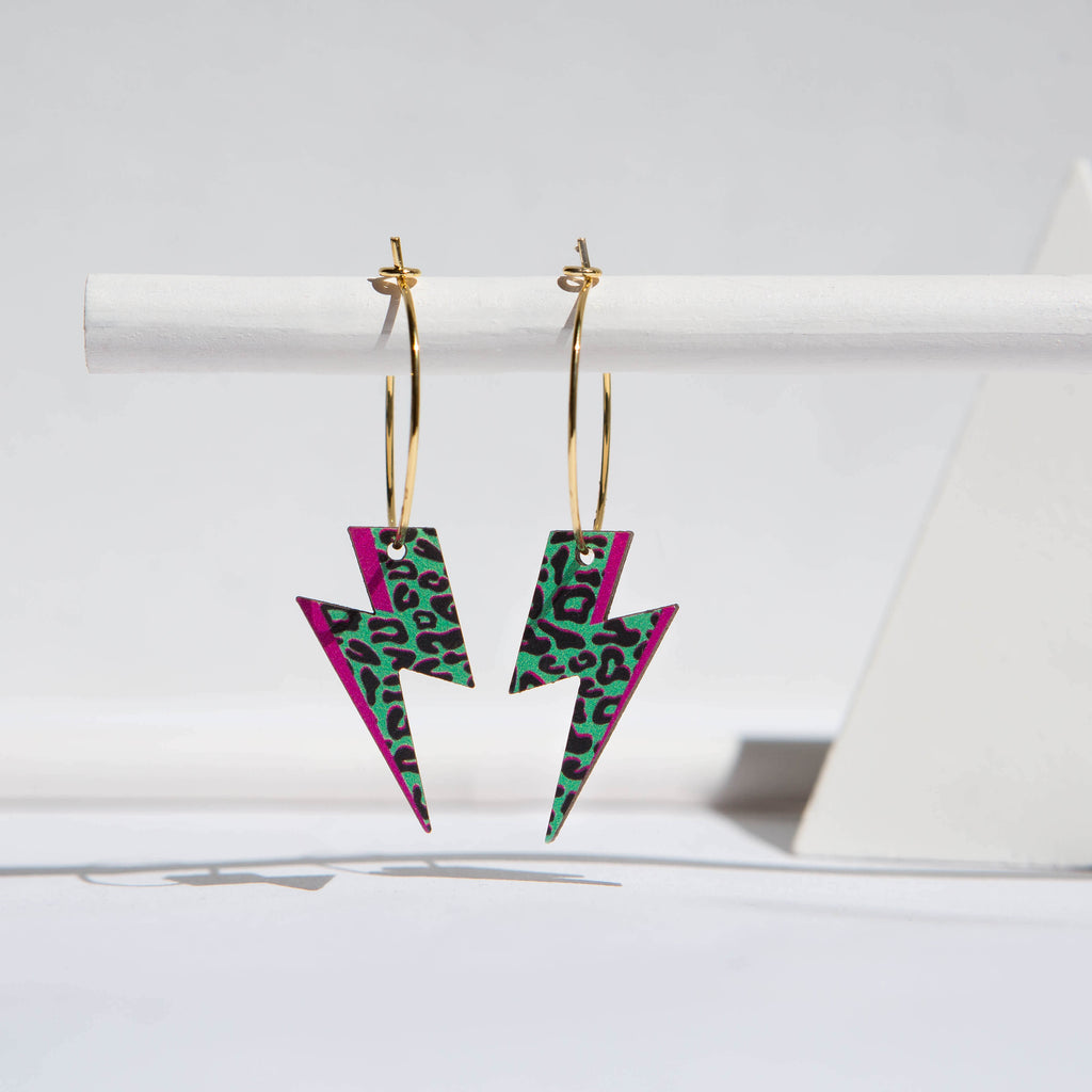 Lightning bolt hoop earrings in bright green leopard print with a flash of pink.