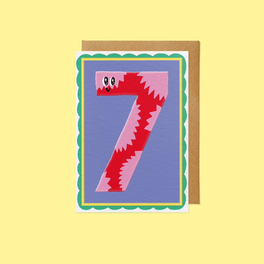 Bold, Colourful and Fun! Number 7 character for a seventh Birthday Card from Sanders de Roeper. - Luxurious 320 GSM fully recycled and recyclable board - Embossment with Spot UV - Elegant recyclable kraft ribbed envelope