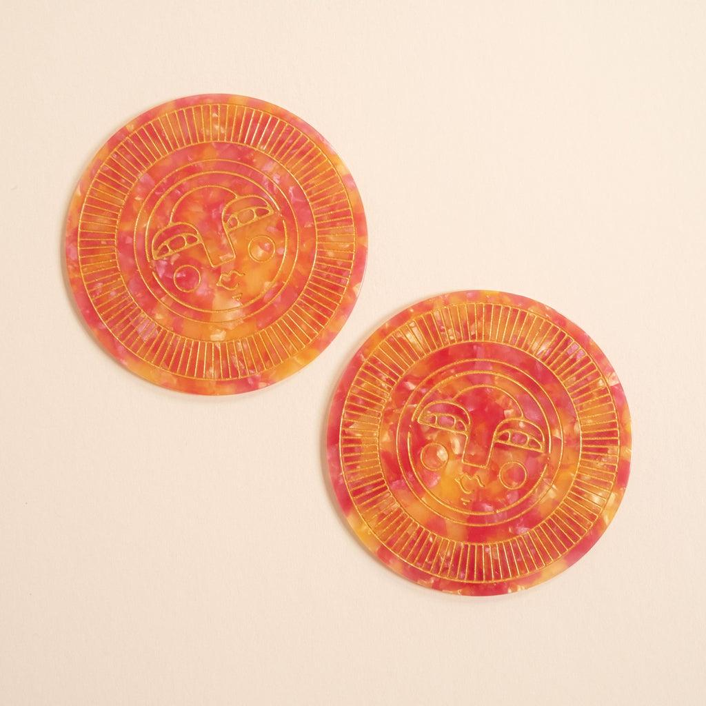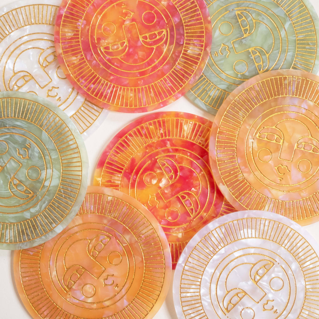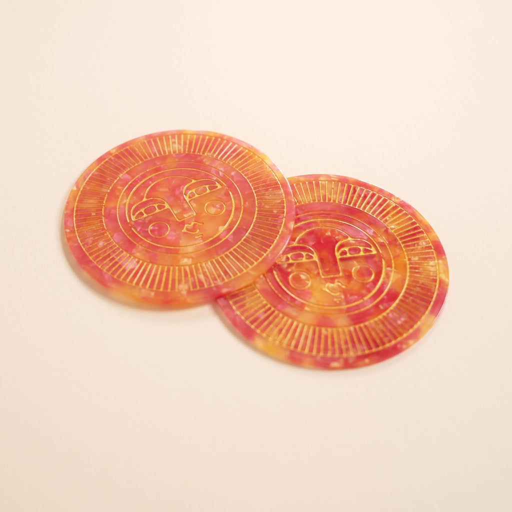 Perfect for indoor or outdoor use, these coasters add a pop of colour to any table setting! •• Made from acetate with engraved, gold filled detail • Variations in the acetate colour and gold filling are to be expected • Approx. 10cm / 4 inches diameter