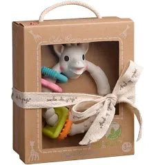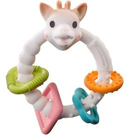 - 3m+ - A colourful teething ring with multiple textures! Featuring several soft parts for baby to chew, with a variety of textures to soothe sore gums. " - Rounded dots, ribbed surfaces, Sophie's ears and horns. - Four brightly coloured geometric shapes which can be moved around the main ring." - Made from 100% natural rubber. - Lightweight ring is easy for little hands to grab and hold. - Comes with gift box.